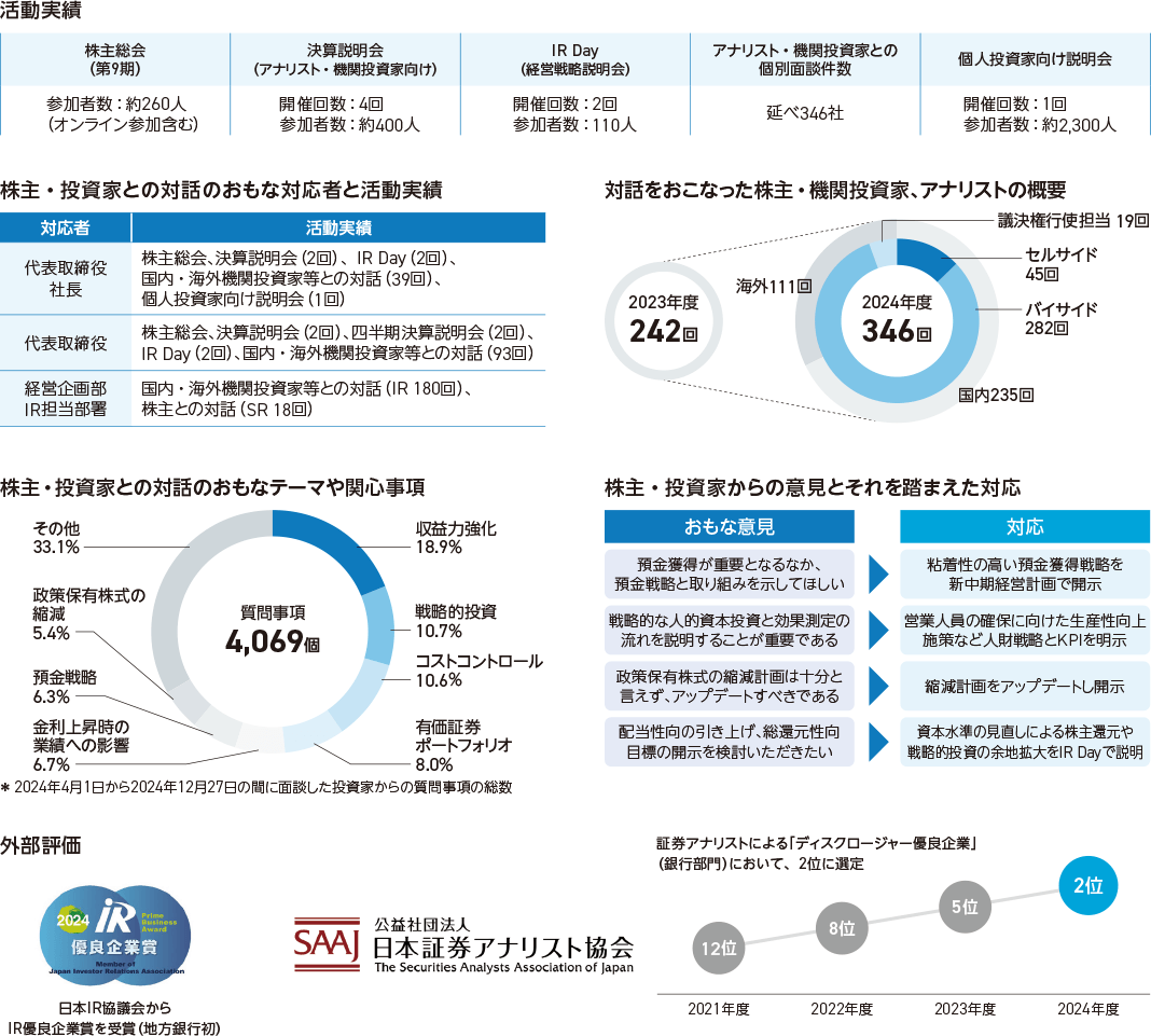 2024年度は、証券会社が主催するIRカンファレンスへの参加を増やすなど海外投資家へのアプローチを強化するとともに、個人投資家 向け施策を着実に遂行しました。また、株主・機関投資家、アナリストとの面談数および説明会参加者数は前年度を大きく上回りました。