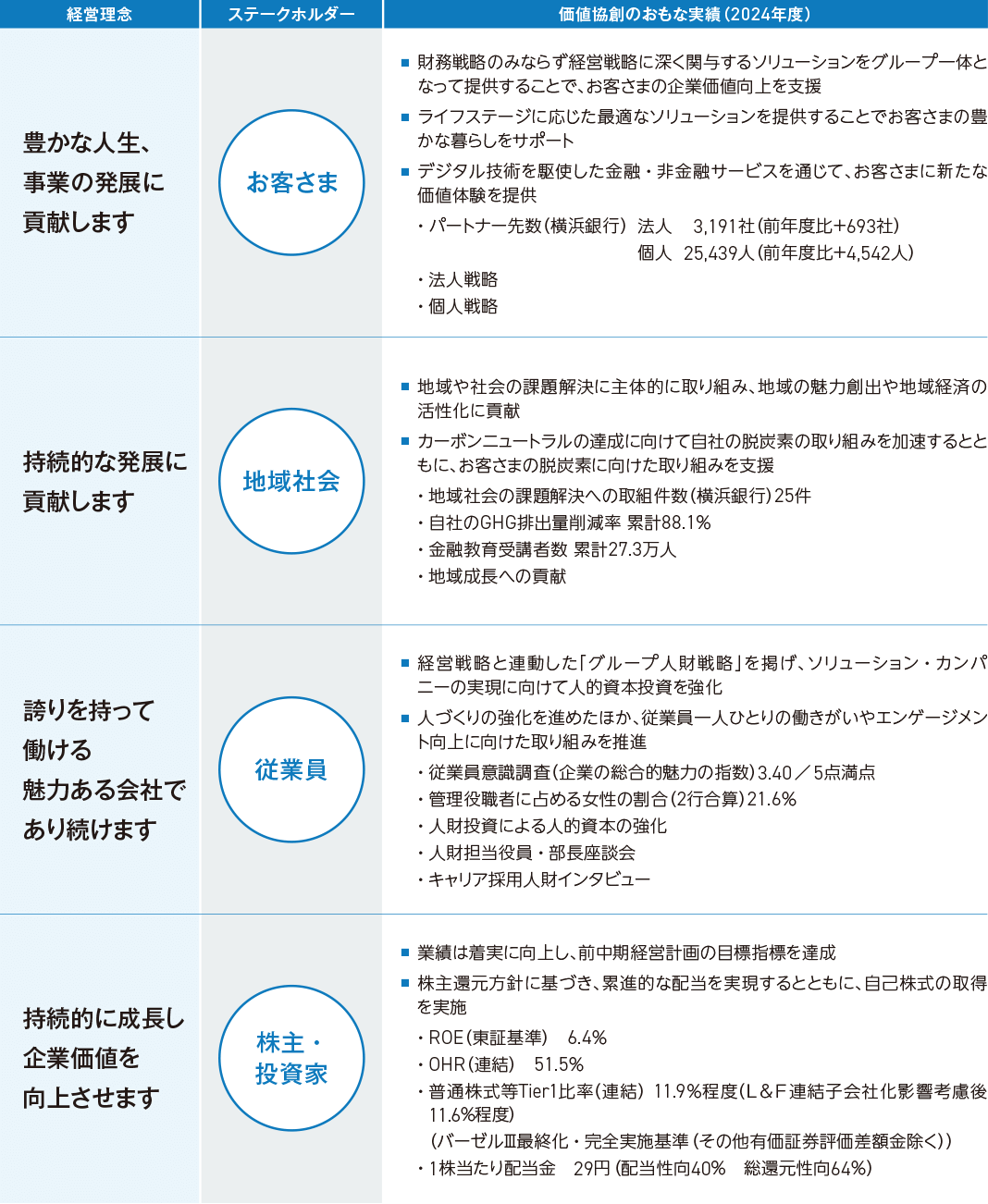 当社グループは、お客さま、地域社会、従業員、株主・投資家などすべてのステークホルダーと適切なコミュニケーションをおこない、情報開示の充実をはかります。また、いただいたご意見やご要望に誠実に耳を傾け、経営の改善に活かし、ステークホルダーの皆さまと、地域における社会的価値・経済的価値を協創しています。