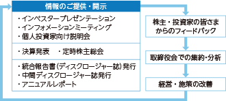 当社は、株主・投資家の皆さまが当社グループの業務内容や財務状況を理解し、経営の健全性を適切に判断できるようわかりやすい情報開示に努めます。また、株主・投資家の皆さまとの対話の機会を重視しており、建設的な対話を促進するための取組方針を定め、積極的なコミュニケーションに努めています。2022年4月には経営企画部にコーポレートコミュニケーション推進室を新設し、非財務情報を含めた情報開示や、株主・投資家の皆さまとの対話を強化しています。