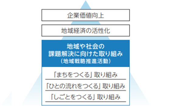 こうした方針のもと、行政の地域ビジョン実現に向けた施策実行を支援するとともに、「まちをつくる」「ひとの流れをつくる」「しごとをつくる」など、地域や社会の課題解決に向けた取り組み(地域戦略推進活動)を進めています。地域のハブとしての役割を発揮し、産学官金連携の幅を広げ、地域社会の活性化と課題解決に向けた取り組みを強化しています。