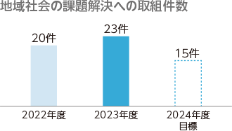本取組方針に基づき、地域戦略推進体制のもと、横浜銀行は地域社会の活性化と課題解決に取り組んでいます。その結果、前中期経営計画で掲げた「地域社会の課題解決への取組件数」の目標15件に対して、2022年度の実績が20件、2023年度の実績が23件、2024年度の実績が25件となり、連続して単年度目標を達成しました。新中期経営計画においても、地域経済への貢献を掲げ、引き続き多様なネットワークを活用し、地域社会の課題解決への取り組みを強化していきます。