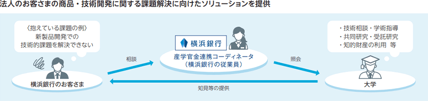 横浜銀行は産学官金の連携強化を通じて、地域社会の課題解決に取り組んでいます。包括連携協定を締結する国立大学法人横浜国立大学、青山学院大学、昭和医科大学から、横浜銀行の従業員が「産学官金連携コーディネータ」 の委嘱を受け、課題解決に資する研究を有する大学と技術的な課題を有する 法人のお客さまの橋渡し役を担っています。