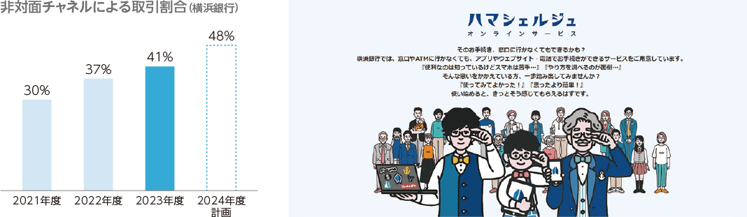 横浜銀行は住所変更、税金・各種料金の払込み、お振込み、口座開設を中心に非対面取引の拡大を進めており、2024年3月から相続発生の届け出のお手続きをウェブサイトから受付が可能となりました。非対面取引の割合は、2024年3月末基準で41%まで増加しています。引き続き非対面取引の拡大を進めて、お客さまの利便性向上に取り組んでいきます。