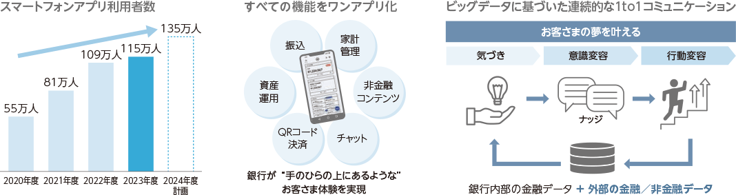 お客さまとの接点が対面から非対面へと変化するなか、個人のお客さま向けに提供しているスマートフォンアプリ「はまぎん365」は最重要チャネルに成長しており、2024年3月末時点で、横浜銀行の115万人のお客さまにご利用いただいています。