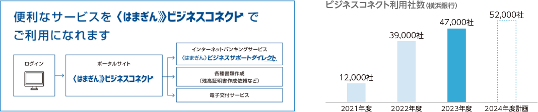 横浜銀行は、2020年1月よりお客さまの利便性向上を目的とした非対面サービスとして、法人向け会員制ポータルサイト「〈はまぎん〉ビジネスコネクト」を提供しており、2024年3月末時点で4.7万社の法人のお客さまにご利用いただいています。