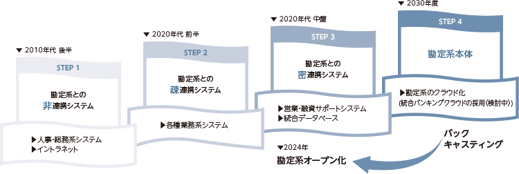 将来の勘定系システムのクラウド化を見据えて、勘定系より遠いシステムから順次クラウド化を進めています。