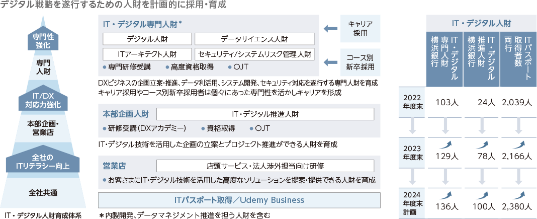 横浜銀行においては、組織全体のITリテラシー向上、専門人財の強化をはかるために、育成体系ごとに人財像・期待役割を定義し、計画的に採用・育成を進めています。2022年10月よりIT・デジタル推進人財の育成を目的として開始したデジタル人財育成プログラム「DXアカデミー」は、2024年3月末時点で78人の合格者を輩出しています。また、全行員のDXスキルの向上に向けて、個人のレベルに応じたコンテンツをタイムリーに学習できる「Udemy Business」を2023年8月に導入し、実務に直結するDXスキルの修得に取り組んでいます。本取り組みの結果、IT・デジタル専門人財は、2024年3月末時点で129人になりました。