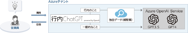 行内ChatGPTは、一般的な「ChatGPT」の機能に加え、両行における各種規程やマニュアルなど行内情報の照会に対応できる機能を備えています。従業員は文書作成などの業務の効率化*をはかりながら、より高度な業務や新たな業務に集中することができます。