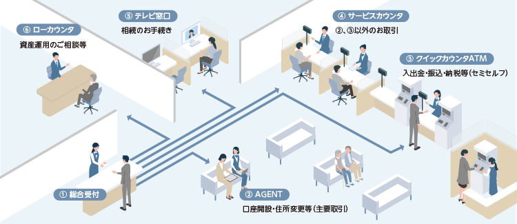 横浜銀行は、「クイックカウンタATM」によりお客さま自身が横浜銀行職員のサポートを受けてキャッシュカードによる入出金などをおこなう「セミセルフ窓口」を、2024年3月末までに77店舗に導入しました。今後もさらなる店頭業務の効率化とお客さまの利便性向上に向けて、本窓口の導入を進めるとともに、TV窓口の設置、次世代型営業店タブレット端末「AGENT」の高度化など次世代型店舗への移行を進めていきます。