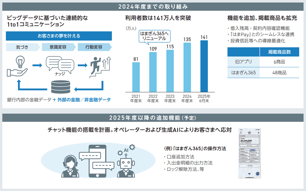 横浜銀行が個人のお客さま向けに展開するスマートフォンアプリ「はまぎん365」は、メインチャネルとしての存在感を強め、 2025年6月末時点で利用者数141万人を突破しました。2024年度には、住宅ローンや各種ローンの借入残高・契約内容の確認機能、決済アプリ「はまPay」とのシームレスな連携といったバンキング機能を強化。さらに、投資信託取引や家計簿アプリへの導線も最適化し、より一層の利便性を追求しました。2025年度以降は、はまぎん365限定定期預金や、AIを活用し、気軽に相談ができるチャット機能の実装を予定しています。今後も「はまぎん365」をお客さまとの重要なタッチポイントと位置付け、最先端のソリューションを提供するとともに、お客さま本位のサービスを追求していきます。