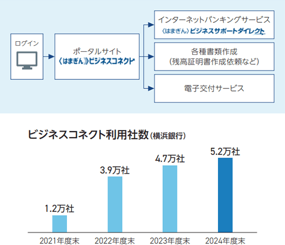 横浜銀行は、お客さまの利便性向上とデジタルコミュニケーション強化を目的とした非対面サービスとして、法人向け会員制ポータルサイト「〈はまぎん〉ビジネスコネクト」を提供しています。インターネットバンキングへのログイン機能の統合や、各種取引のオンライン完結、「お知らせ」機能によるお客さまへの情報提供などを通じて、2025年3月末時点で5.2万社の法人のお客さまにご利用いただいています。今後もさらなる機能拡充を通じて、総合取引の拡大をめざしていきます。