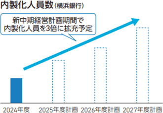 横浜銀行では、システムの内製開発体制を強化し、「はまぎん365」の追加機能や営業店タブレット端末「AGENT」の機能追加、お客さま向けWEBサービスの拡充を推進しています。従来のように外部のシステム会社に開発を委託する方法では、お客さまの多様なニーズや急速に進化するデジタル技術に迅速に対応することが難しい状況がありました。内製化を進めることで、開発スピードを向上させるとともに、利便性の高いサービスをより早くお客さまにお届けすることが可能になります。これにより、より良いサービスの提供を通じて、お客さま満足度のさらなる向上をめざしています。