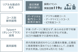 当社グループの取り組みを効果的に発信し、これまで以上に魅力を感じられるよう、SNS等も活用しながら人財育成体系やキャリア形成支援に関する情報発信を強化しています。また、5Daysインターンシップやオープン・カンパニーの実施により学生との接点を強化し、当社グループへの関心向上をはかるとともに、コース別採用やTalent+(タレントプラス)採用、高卒採用など、多様な経験やバックグラウンドを持つ人財の採用を積極的におこなっています。なお、横浜銀行では、2026年4月以降入行者の初任給について、総合職・大卒の場合に、28万円(+2万円)への引き上げを予定しています。