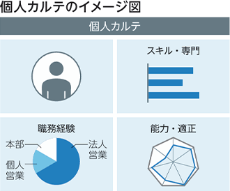 当社グループでは、従業員一人ひとりのスキルや知識、適性やキャリアデザインといった情報を一元管理するツールとして、タレントマネジメントシステムを導入しており、従業員の能力を最大限発揮するための戦略的な人事運用への活用を進めています。従業員のスキルやコンピテンシー、属性を可視化することで、マネジメント層が部下のキャリア支援をおこなうために把握すべき情報を集約した「個人カルテ」や、自身のキャリア形成の参考とするためにロールモデルとなる従業員の職務経歴を閲覧できるようにするなどの機能拡充をおこなっています。適材適所の人員配置の実現をめざし、営業店や本部各部署の特性に応じた戦略的な人員配置が可能となる仕組みを整備しています。