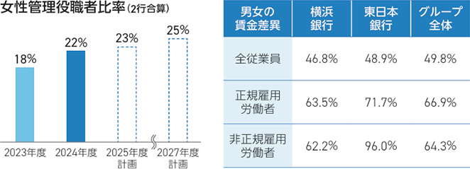 こうした取り組みにより、横浜銀行・東日本銀行合算の女性管理役職者比率(2024年度末21.6%)を、2027年度には25%に引き上げることを目標としています。また、マネージャーの多様性を中長期的に確保していくため、新卒採用者に占める女性割合は30%以上を目標としています。また、当社グループでは、管理役職者以上の従業員における男性比率が高いため、男女賃金の差異が生じています。当該差異の解消に向けて、女性管理役職者の育成・登用を積極的におこなっています。