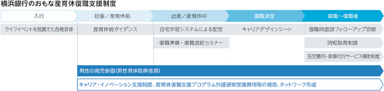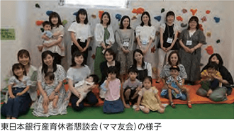 当社グループでは、育児等のライフイベントに応じて柔軟に働くことができるよう、時短勤務制度や、託児費用・家事代行サービスの費用補助制度を用意しています。横浜銀行では、「産育休復職支援プログラム」を導入し、休業中の自己学習のサポートや座談会の開催を通じて、従業員がスムーズに復職できる態勢を整えています。さらに、2024年度には、産育休からの復職者を対象に、希望者が先輩従業員に相談できるメンター制度を導入しました。東日本銀行では、産育休中の女性従業員同士の交流会を通じて、復職に向けたネットワークづくりを支援し、スムーズに復職できる体制を整えています。