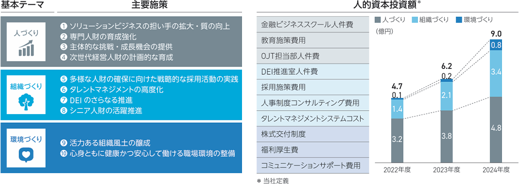 グループ人財戦略に基づく施策の実施にあたっては、ソリューションビジネスを支える人財育成に重きを置いた「人づくり」を中心に、「組織づくり」、「環境づくり」を含め、人的資本投資を強化していきます。