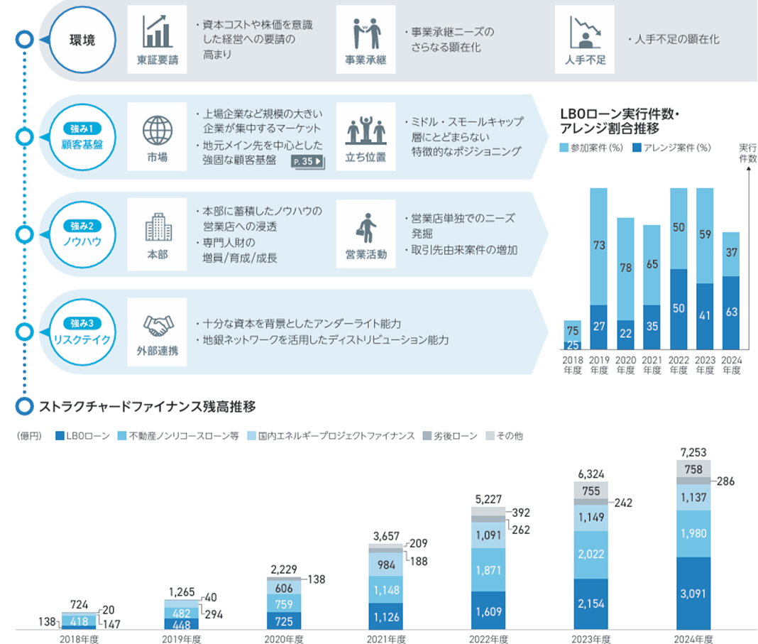 当社グループのソリューションビジネスの強みは、強固な顧客基盤、高度なソリューション提供ノウハウ、そして健全な資本に裏打ちされたリスクテイク力にあります。 当社グループは、中小規模のお客さまから上場企業など規模の大きなお客さまが集積する神奈川県・東京都において、長年培った顧客基盤を活かし、戦略的なソリューションを提供できる機会を有しています。 2019年には、本部直接営業部隊であるソリューション営業部を設置し、高度なソリューションノウハウを蓄積してきました。このノウハウを営業店へ広げ、浸透させたことで、より多くのお客さまのニーズ発掘、課題解決へつながっています。また、ファンドとの関係強化を通じて資本戦略ソリューションの提案力も高まり、市場での存在感が着実に向上しています。 加えて、十分な資本と地銀ネットワークを活用したディストリビューション能力を背景に、数百億円規模の融資にも対応可能であり、ミドル・スモールキャップのみならず、あらゆるステージのお客さまの課題解決に向き合うことのできる特徴あるポジションを確立しています。 こうした強みに加えて、東京証券取引所からの「資本コストや株価を意識した経営」への要請や中小企業の事業承継ニーズの高まりを背景に、M&Aファイナンスの一種であるLBOローンが力強く伸長しています。今後もお客さまの経営戦略に資する高度な戦略ソリューション提供を通じて、付加価値の高いビジネスの拡大に取り組んでいきます。
