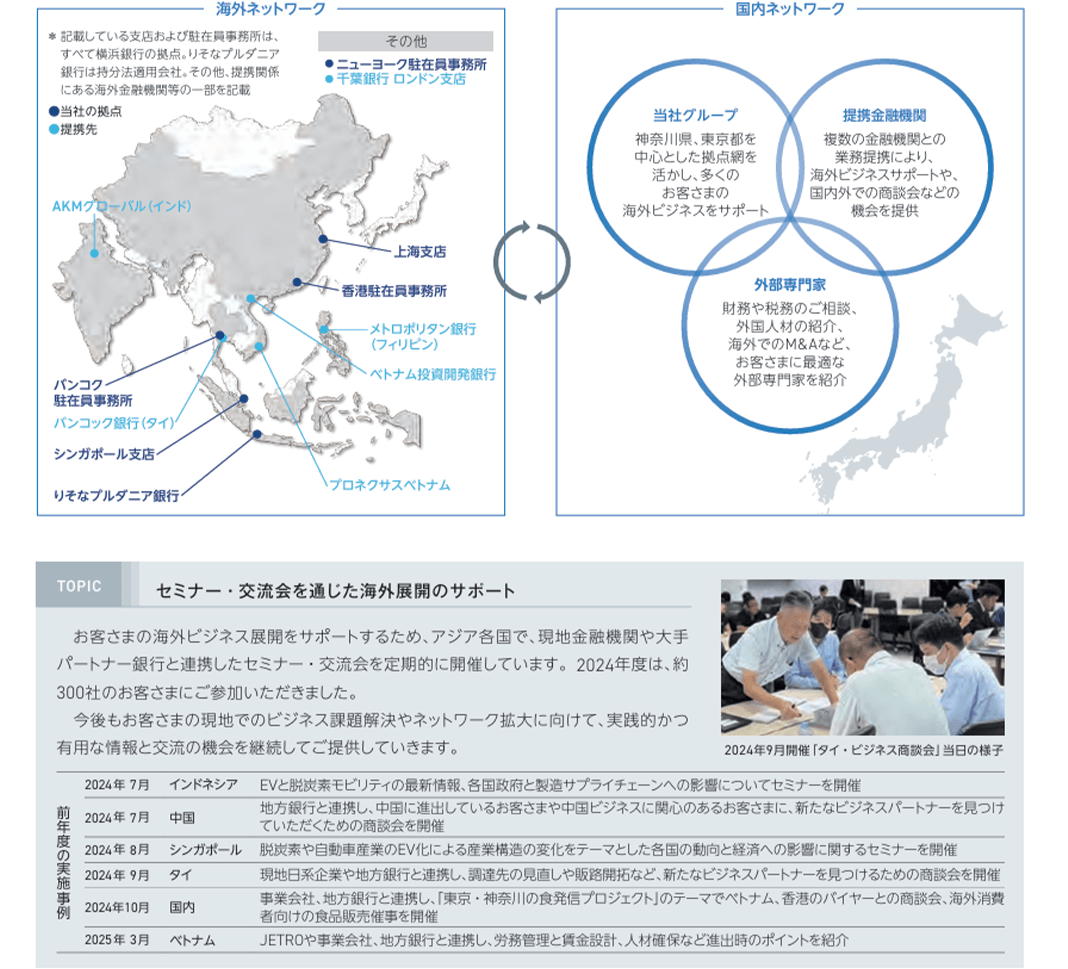 当社グループでは、国内外におけるお客さまのビジネス展開を総合的にサポートしています。 海外ビジネスにおいても、成長地域であるアジアを中心とした幅広い海外ネットワークと高い専門性、さらに国内ネットワークとの連携を活かし、グローバル展開をめざすお客さまにきめ細やかなサービスを提供し、お客さまの海外進出・取引拡大を後押ししています。