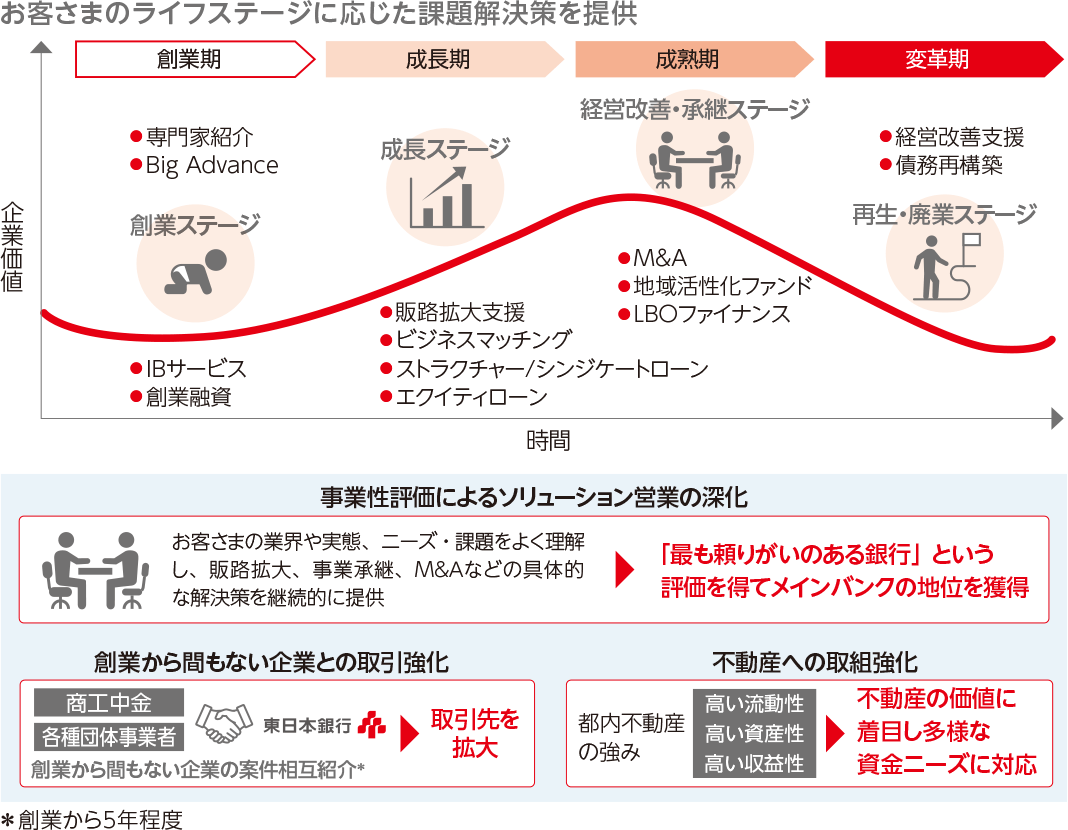 事業性評価を通じてお客さまのニーズや課題をよく理解するとともに、ライフステージに応じた課題に対するソリューションメニューを充実させ、お客さまの持続的な企業価値向上に貢献していきます。