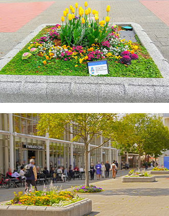 当社グループの横浜銀行は、横浜市が取り組む緑化活動に協力し、2013年にJR桜木町駅前広場に高木10本、花壇5基を寄贈しました。四季折々の花で地域の方々や観光客をお出迎えしたいという思いを込め、花壇を「横浜銀行 ふれあい花壇」と名付けています。以降、この花壇がみなとみらい21地区の玄関口を明るく彩り、皆さまのいこいの場となるように、季節の花々を植栽しています。