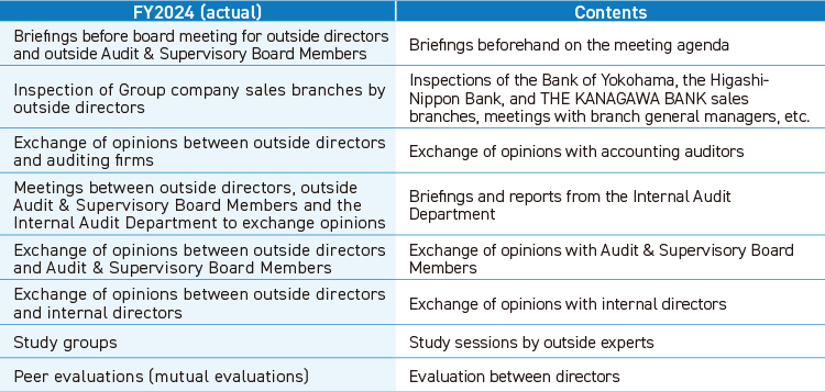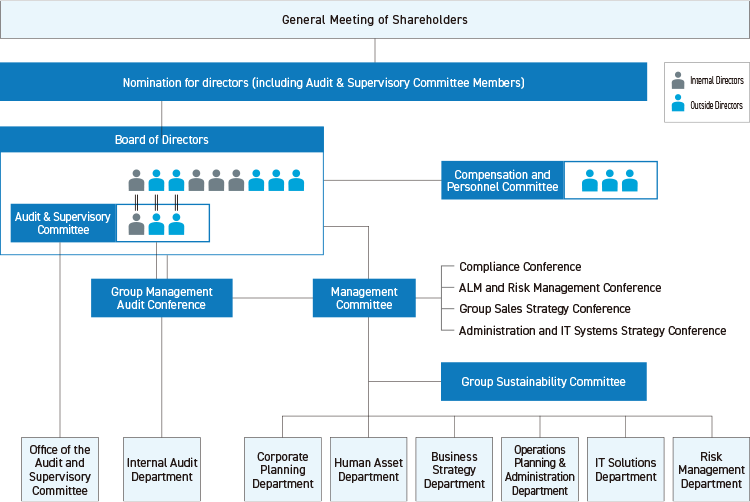 The Board of Directors makes decisions on important matters such as matters related to the management plan and governance and basic policies on risk and compliance in order to enhance discussions on the management strategies of the Group. Directors who are Audit & Supervisory Committee Members are directly involved in the discussions and decision-making processes of the Board of Directors and thus assume a highly effective supervisory function over management. In addition, in order to strengthen cooperation within the Group and enhance governance, the Company and the Bank of Yokohama have integrated the operation of the Board of Directors, and a system has been established where the Company's directors can participate in the Higashi-Nippon Bank’s board meetings, etc. as observers.