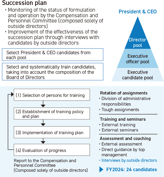 The status of the formulation and operation of the plan is regularly reported to the Compensation and Personnel Committee, which is composed solely of outside directors. Outside directors not only receive reports but also strive to improve the effectiveness of the succession plan by gaining a multifaceted understanding of the candidates through various meetings, interviews, and discussions, and by providing advice and recommendations to the candidates based on their extensive knowledge and experience.