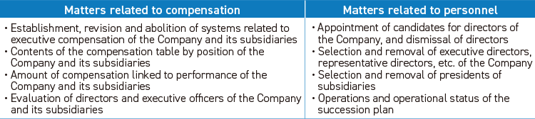 - Establishment, revision and abolition of systems related to executive compensation of the Company and its subsidiaries