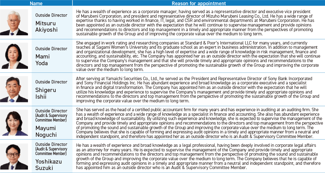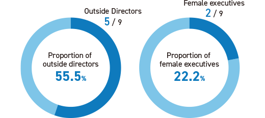 In order to ensure the independence of the Board of Directors and to demonstrate that it functions fairly and transparently, the Company appoints a number of outside directors who maintain views that are independent from the Group, making up at least one-third of the members. By combining internal directors who are familiar with the Group’s business with outside directors with extensive experience and knowledge outside the Company and giving the Board of Directors diverse members with different backgrounds of specialist knowledge and experience, the group ensures a good balance of knowledge,experience and skills on the Board of Directors. Of the nine directors (seven men and two women), five are independent outside directors.