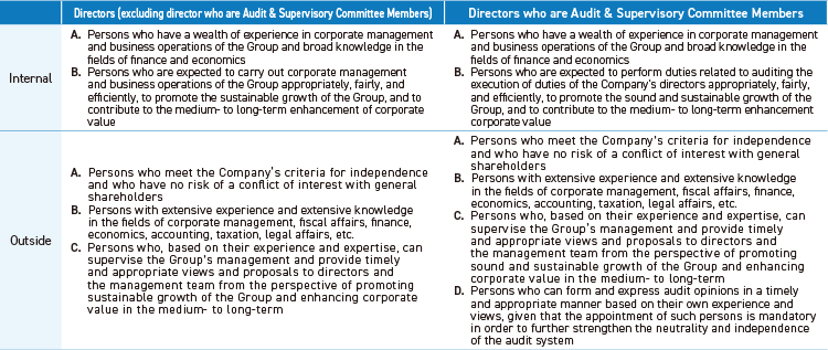 Candidates for directors (excluding directors who are Audit & Supervisory Committee Members) are appointed by the Board of Directors after any deliberation by the Compensation and Personnel Committee. In addition, candidates for directors who are Audit & Supervisory Committee Members are appointed by the Board of Directors after any deliberation by the Compensation and Personnel Committee and with the consent of the Audit & Supervisory Committee. Persons satisfying the following items are appointed from among candidates. In appointing, the Company will take into account the Company's policy on the composition of the Board of Directors and the length of his/her service as an Officer of the Group, etc.
