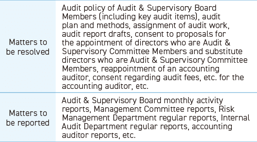 The Audit & Supervisory Committee works closely with the Internal Audit Department, the Internal Control Department, and accounting auditors to conduct systematic, effective, and effi cient audits utilizing the Company's internal control system. In addition, the Audit & Supervisory Committee decides opinions on the appointment, dismissal,etc., and compensation, etc., of directors (excluding Audit & Supervisory Committee Members) as a supervisory function for business executives.