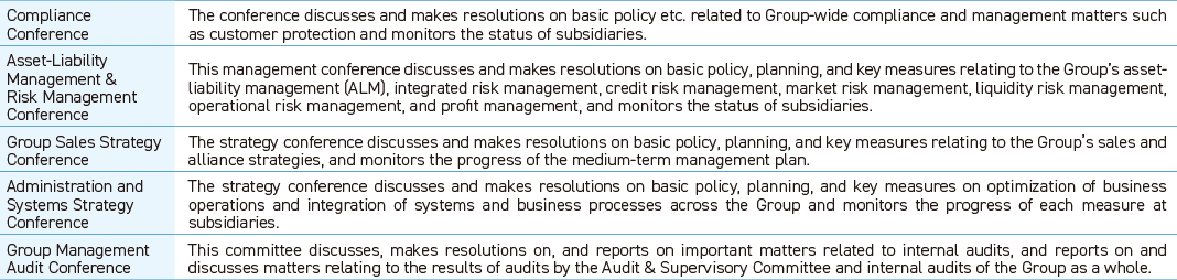 In addition, for important matters related to the Group’s business execution, the meetings listed below are positioned as part of the Management Committee, and these meetings conduct intensive deliberation on items within their respective jurisdictions.