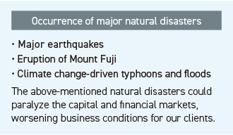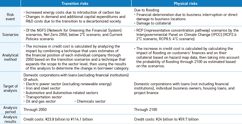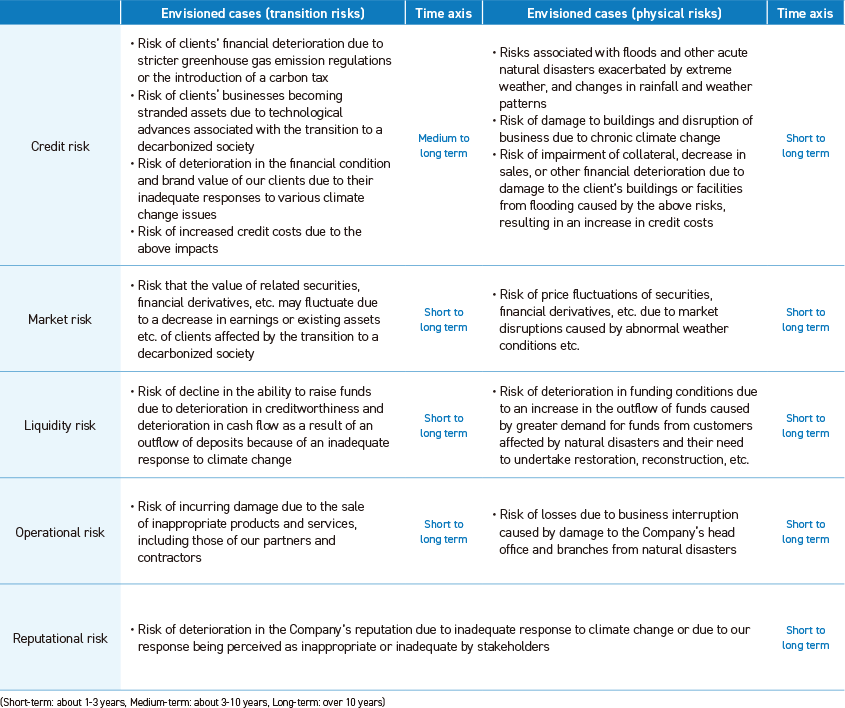 The Group is working to identify and assess two types of risks related to climate change in line with TCFD recommendations ̶ that is, risks associated with the transition to a decarbonized society (transition risks) and risks associated with severe natural disasters and extreme weather events (physical risks). Transition risks and physical risks for each of the risks that the Group categorizes and manages (credit risk, market risk, liquidity risk, operational risk, and reputational risk) are as follows.
