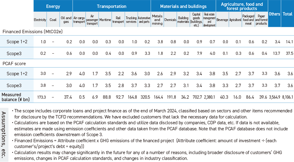 As a financial institution, the Group is a member of the Partnership for Carbon Accounting Financials (PCAF), an international initiative that promotes initiatives related to the measurement and disclosure of GHG emissions in investment and loan portfolios, in order to contribute to creating a decarbonized society through the realization of GHG emissions net zero in investment and loan portfolios. In addition, the Group calculates GHG emissions (Financed Emissions) in the investment and loan portfolio, mainly for business loans, based on the standards set forth by the PCAF (hereinafter referred to as the “PCAF Calculation Standards”).