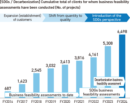 Since FY2016, we have engaged with our customers to resolve their management issues through business feasibility assessments*1. In FY2022, we introduced SDGs business feasibility assessments*3 and launched decarbonization feasibility assessments that focus on clients’ management issues related to decarbonization. With decarbonization business feasibility assessments, we engage with customers using a newly created Decarbonization Check Sheet to organize and share management issues related to decarbonization, including visualizing GHG emissions. Through this type of engagement, we will continue to provide optimal solutions for our customers’ business challenges and support their sustainability management, including decarbonization.