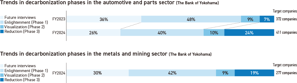 As part of our engagement in these sectors, we conduct interviews with clients about their external environment and initiatives in decarbonized management and work to understand the situation. In FY2024, about 30% of target companies in both sectors identified visualization and reduction of GHG emissions as challenges. We expect growing requests from the companies in our customers’ supply chains to cut carbon. We will therefore continue to provide our customers with the support they need for visualizing GHG emissions and setting reduction targets.