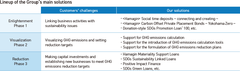 The Group recognizes that it is important to engage with customers to share the challenges they face in order to reduce transition risks and physical risks and to expand opportunities for growth, to enhance the lineup of solutions that contribute to solving their challenges, and to provide the optimal solutions that meet the needs of each customer. The main types of support provided by the Group according to the customer's phase of decarbonization management are as follows.