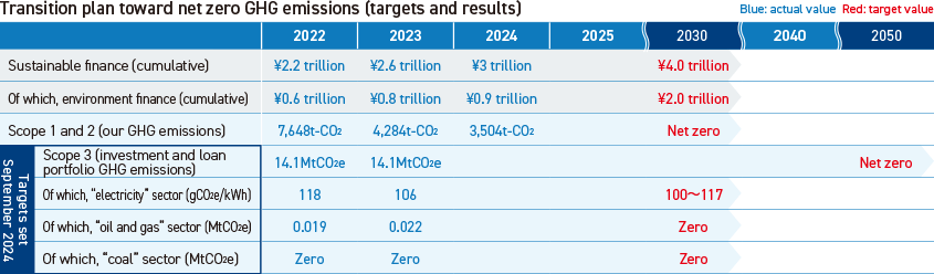 As a community-based financial institution, the Group recognizes its responsibility to play a leading role in decarbonizing local communities.Based on this recognition, we have positioned “conserving and preserving the environment” as materiality, and have set cumulativedisbursement targets for sustainable finance and environment finance, and GHG emissions reduction in our own operations as “long-term sustainability KPIs” (targets to be achieved by FY2030). In September 2024, we set a net zero by 2050 target for GHG emissions in the investment and loan portfolio and interim targets for the electric power, oil and gas, and coal sectors for FY2030 in order to actively promote the decarbonization of local customers.