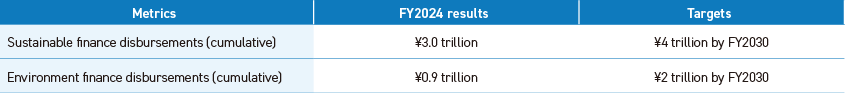 The Group has set targets for cumulative disbursements of sustainable finance and environment finance as “long-term sustainability KPIs” in order to contribute to solving clients’ environmental and social issues, including responding to climate change and natural capital.See “Metrics and Targets (Climate Change)” for FY2024 results.