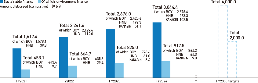 Cumulative disbursements of sustainable finance in FY2024 totaled ¥3 trillion, of which ¥0.9 trillion was disbursed in environment finance.
