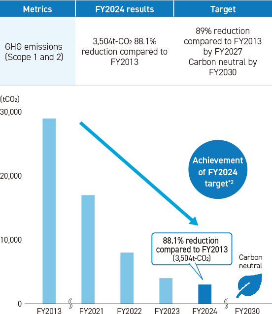 In FY2024, the Group's GHG emissions (Scope 1 and 2) amounted to 3,504t-CO, down 88.1% from the FY2013 level.The Group is working to achieve its targets by introducing energy-saving equipment, switching to high-quality renewable energy sources for its own contracted electricity, and installing solar power panels on its own properties.