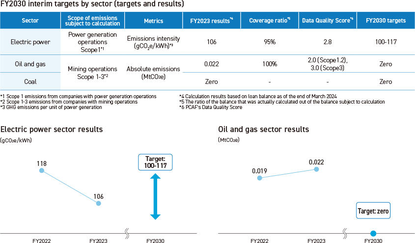 In FY2023, we set GHG emissions reduction targets in the electric power, oil and gas, and coal-related sectors. In the electric power sector, the emission intensity declined due to an increase in the proportion of loans to renewable energies in the balance of loans to the electric power sector. In the oil and gas sector, emissions remained at a low level despite an increase in emissions due to factors such as an increase in the proportion of financing from the Group to financing by companies subject to calculation.