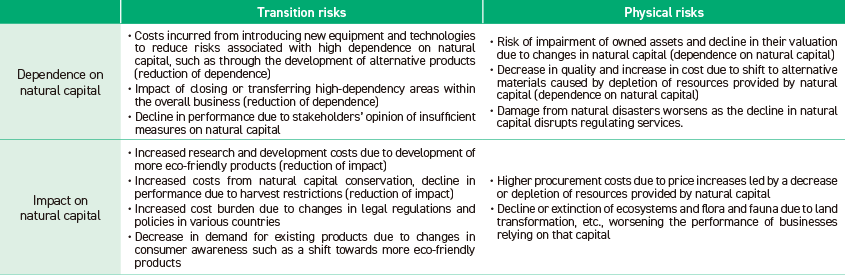 Financial institutions are linked not only to their own business activities (mainly sales activities at each location), but also to the activities of customers and their supply chains through investment and financing activities. In addition to identifying the relationship between the Group's operations and natural capital, we are also working to identify the “dependency” and “impact” on natural capital of our clients through our investment and financing activities and to appropriately manage risks. At the same time, we are working to seize business opportunities by providing financial products and services related to natural capital.