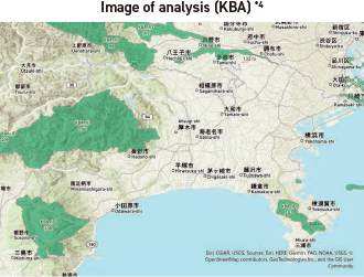 In order to identify the negative impact of its operations on the natural environment, the Group analyzed the points of contact with areas of high biodiversity importance, such as protected areas*1, Key Biodiversity Areas (KBA)*2, and the Biodiversity Intactness Index*3, based on information obtained from the domestic bases of the Bank of Yokohama, the Higashi-Nippon Bank, and THE KANAGAWA BANK. As a result, it was confirmed that there are bases that have points of contact with highly important areas of biodiversity, such as the Tanzawa-Oyama and Hakone areas. However, given that these are general offices and are types of businesses that use land that has already been developed, the negative impact on nature is deemed to be limited. We will continue our efforts to reduce the environmental impact of our business activities in order to be environmentally conscious.