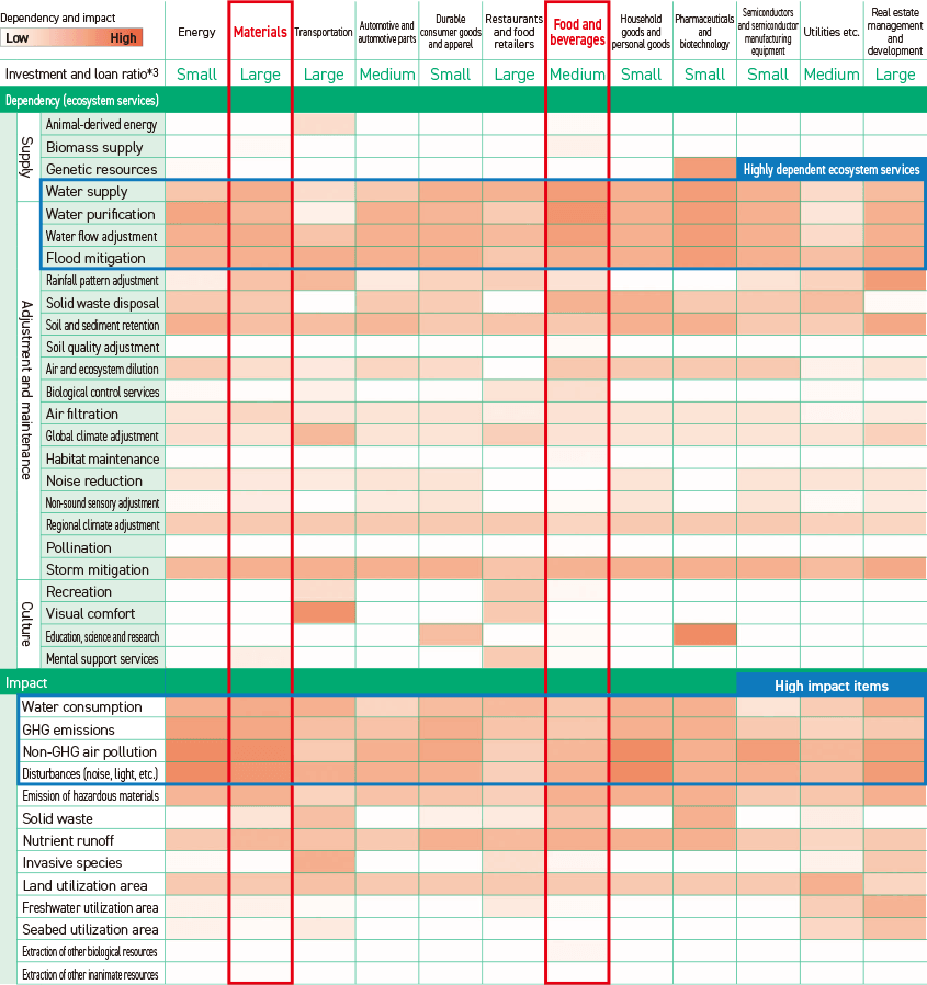In order to understand the relationship with natural capital through its investment and financing activities, the Group used “ENCORE”*1 to analyze the dependence and impact on natural capital in each sector*2. The analysis revealed a high degree of dependence on ecosystem services related to water across sectors, as well as a high degree of impact on natural capital from water use and air pollution. In addition, we narrowed down the sectors that require priority measures (priority sectors), such as the “Materials” and “Food and beverages” sectors, which have a particularly high degree of dependence and impact and are highly weighted in the Group’s portfolio.
