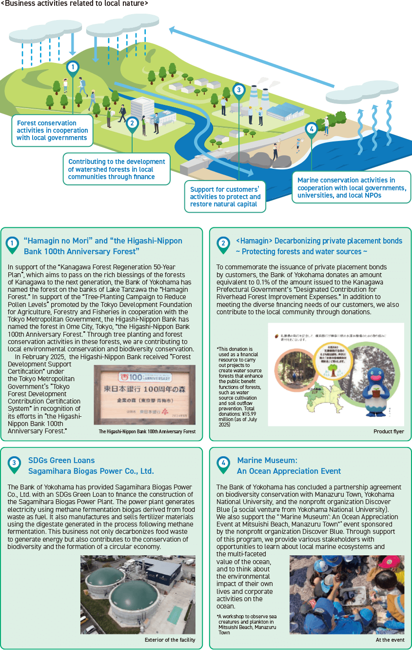 The Group provides financing support and other solutions for projects that contribute to the conservation and restoration of natural capital with the aim of promoting customers’ initiatives to become nature positive. As part of our own efforts, we cooperate with local governments and other organizations to contribute to the preservation and restoration of natural capital in local communities.