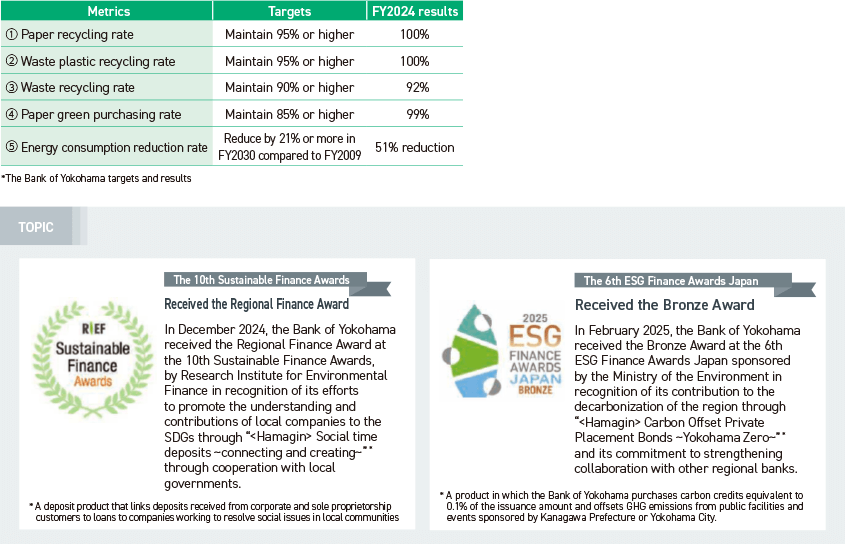 Our Group Environmental Policy sets out to promote resource and energy saving, waste recycling, and effortsto lessen our environmental impact. In our effort to reduce our environmental impact, at the Bank of Yokohama andthe Higashi-Nippon Bank, we set targets for the recycling rates of paper, waste plastic, and waste materials, thegreen purchase rate of paper, and the reduction rate of energy consumption.