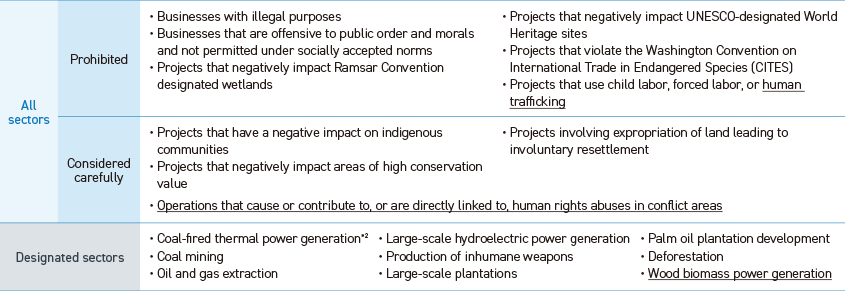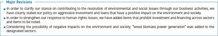 The Group has established a Sector Policy regarding investments and financing that take environmental and social considerations into account. Through the sector policy, we are working to reduce and avoid negative environmental and social impacts by identifying businesses in sectors where we ban or restrict investment and lending, and also having guidelines for certain sectors, with regard to investments and loans for the use of funds that are highly likely to promote negative impacts.The Group Sustainability Committee regularly discusses the necessity of revisions and reviews the Sector Policy as needed in response to changes in our own business activities and the external environment. The following revisions were made in March 2025.