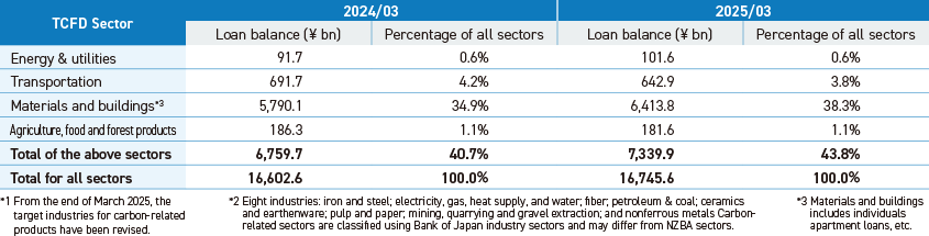 The Group calculates the climate change risk of carbon-related assets*1 based on the TCFD recommendations as one of its efforts to understand loan balance. Calculation results as of the end of March 2025 are as follows.