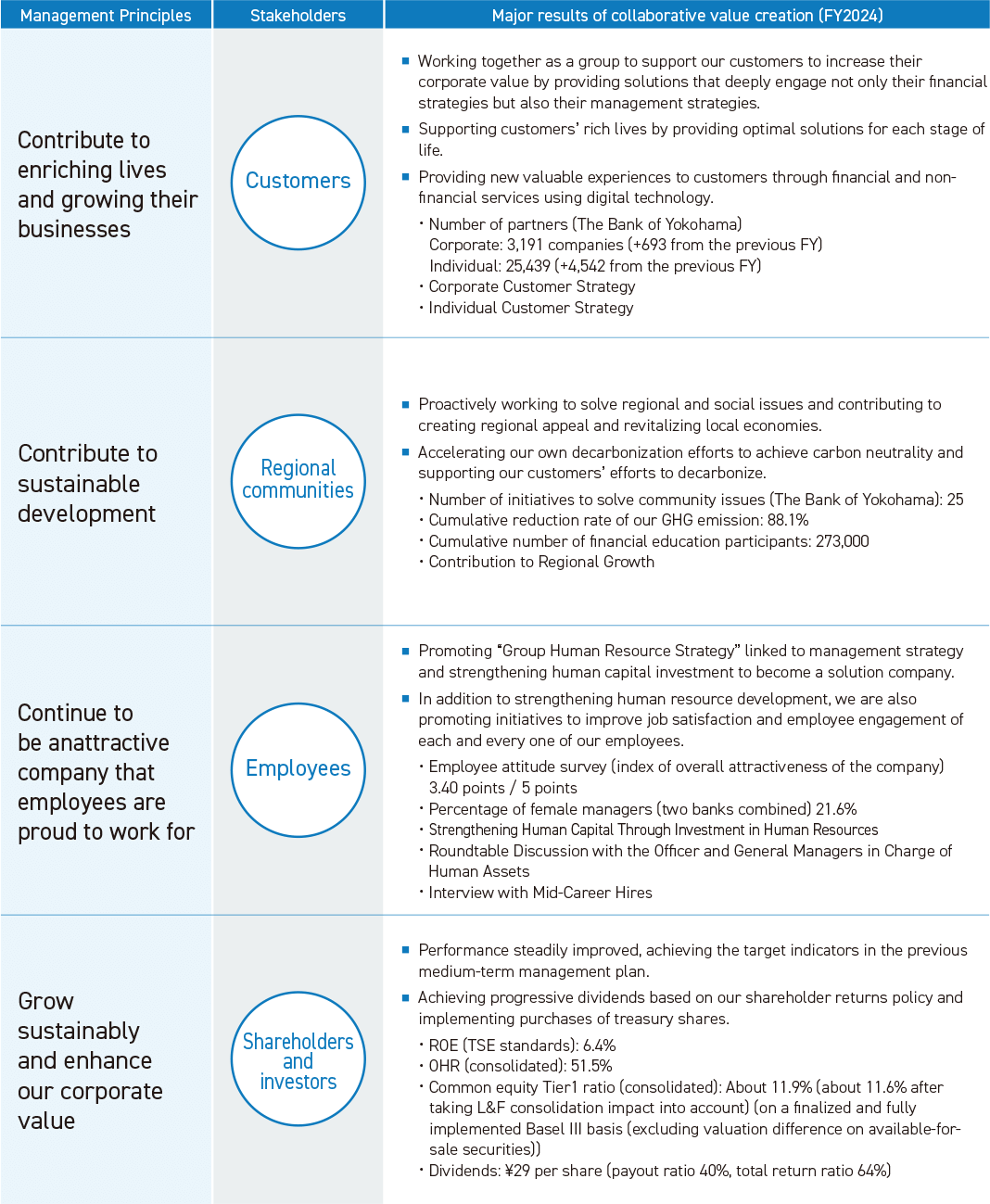 The Yokohama Financial Group communicates appropriately with all stakeholders - customers, local communities, employees, shareholders, and investors - in order to strengthen information disclosure. We also listen sincerely to the opinions and requests we receive and use them to improve our management and the Group works with our stakeholders to collaboratively create social and economic value in the region.